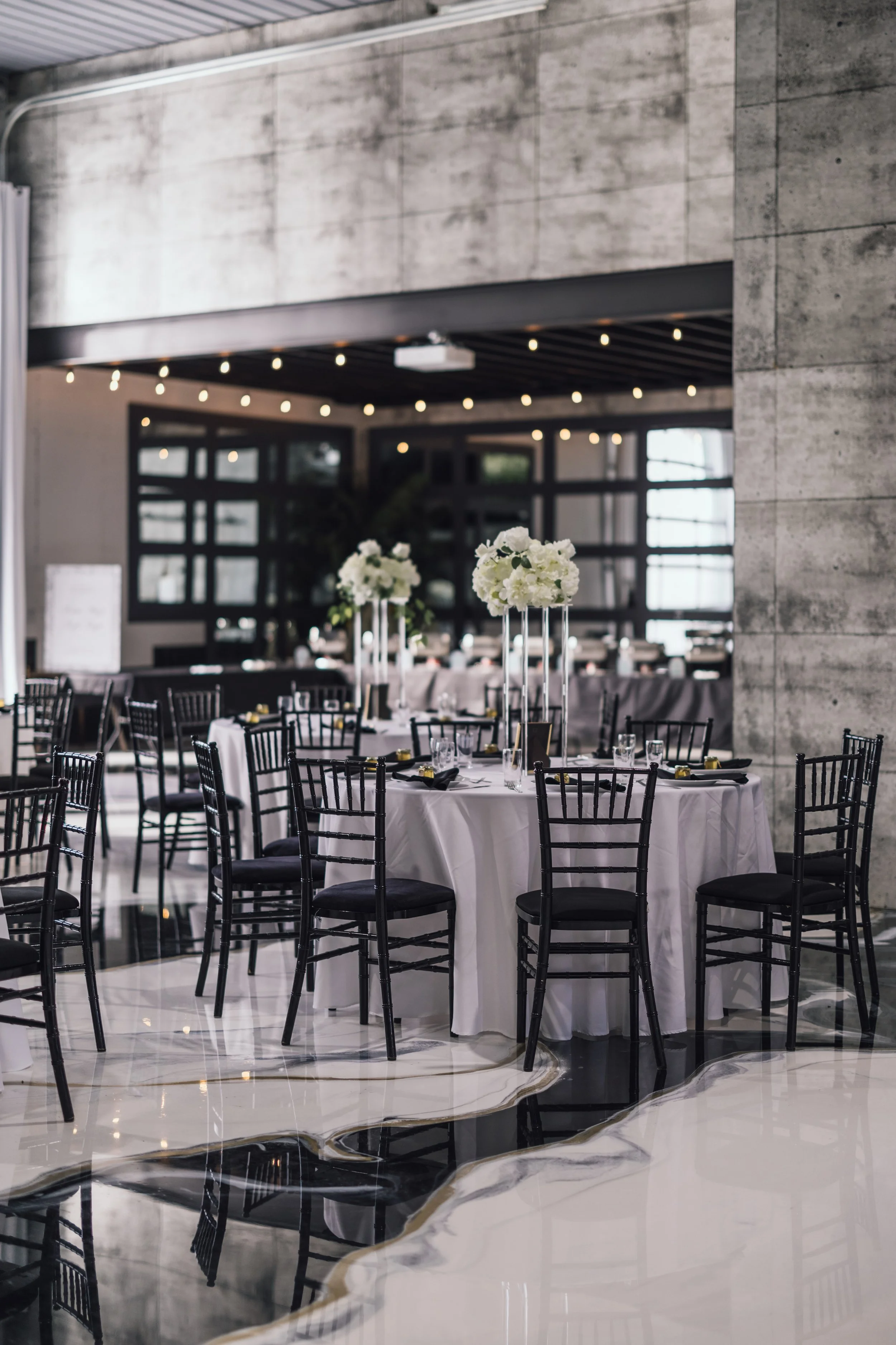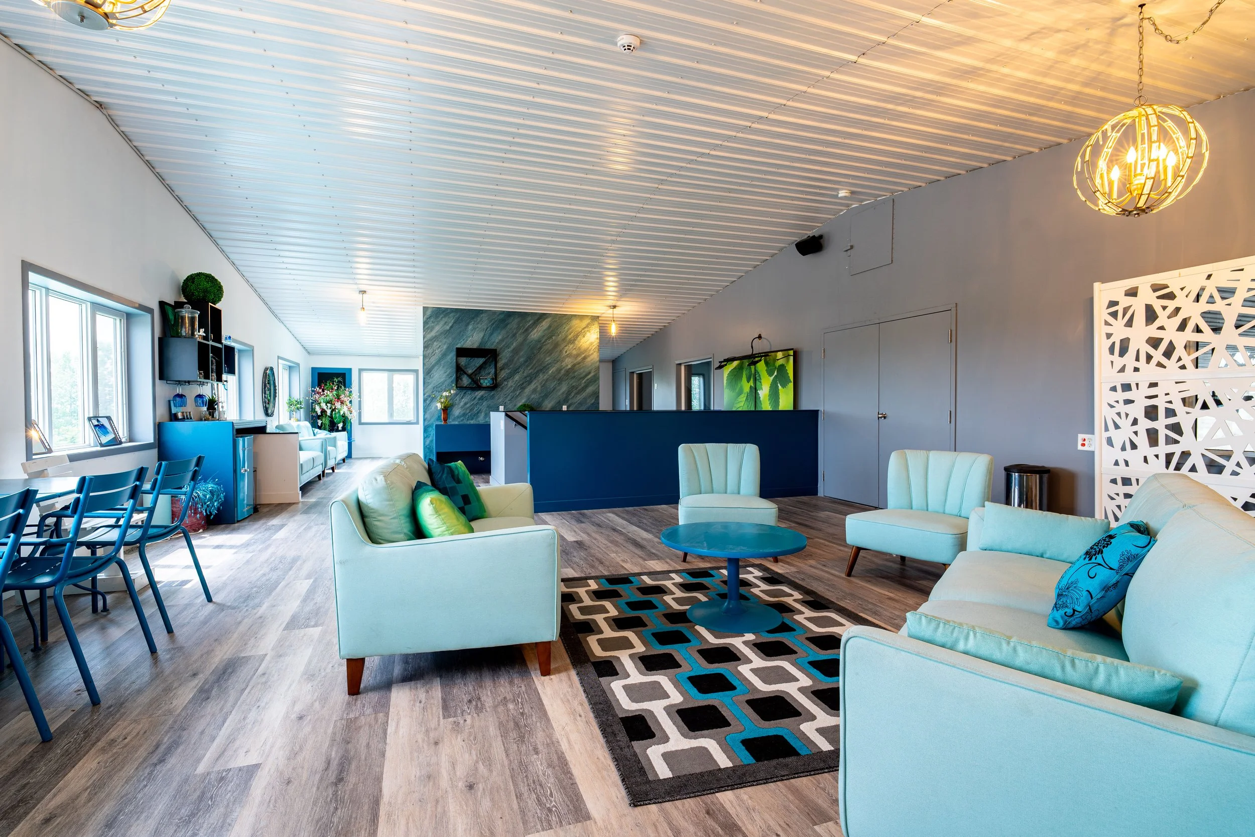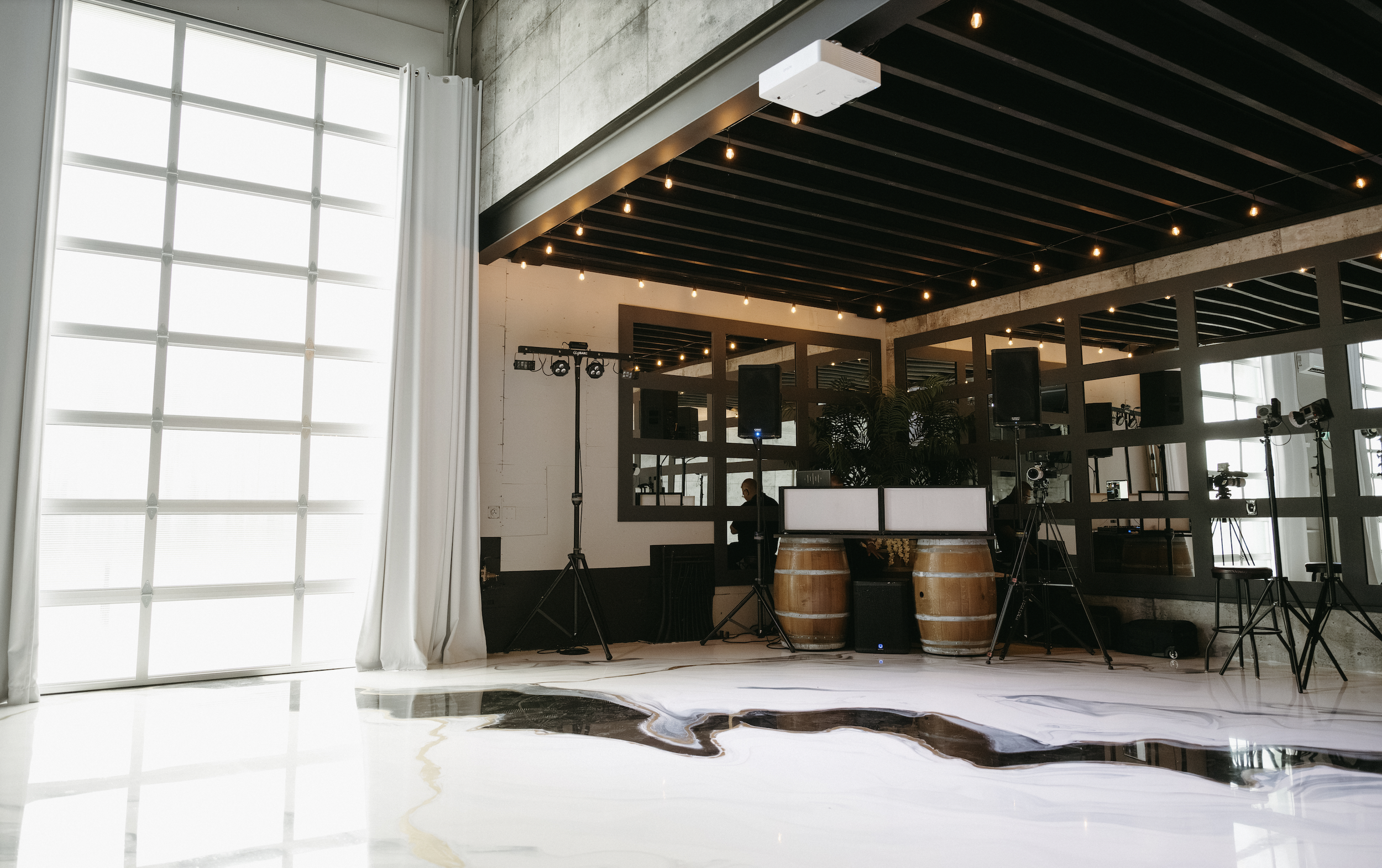 4,000 sq ft., high ceilings & a transparent overhead door—flooded with natural light year-round. Perfect for intimate to grand events. Equipped with a state-of-the-art projection and sound system featuring projectors in all corners, this area provides the flexibility to accommodate various event setups, from elegant weddings to dynamic corporate events.