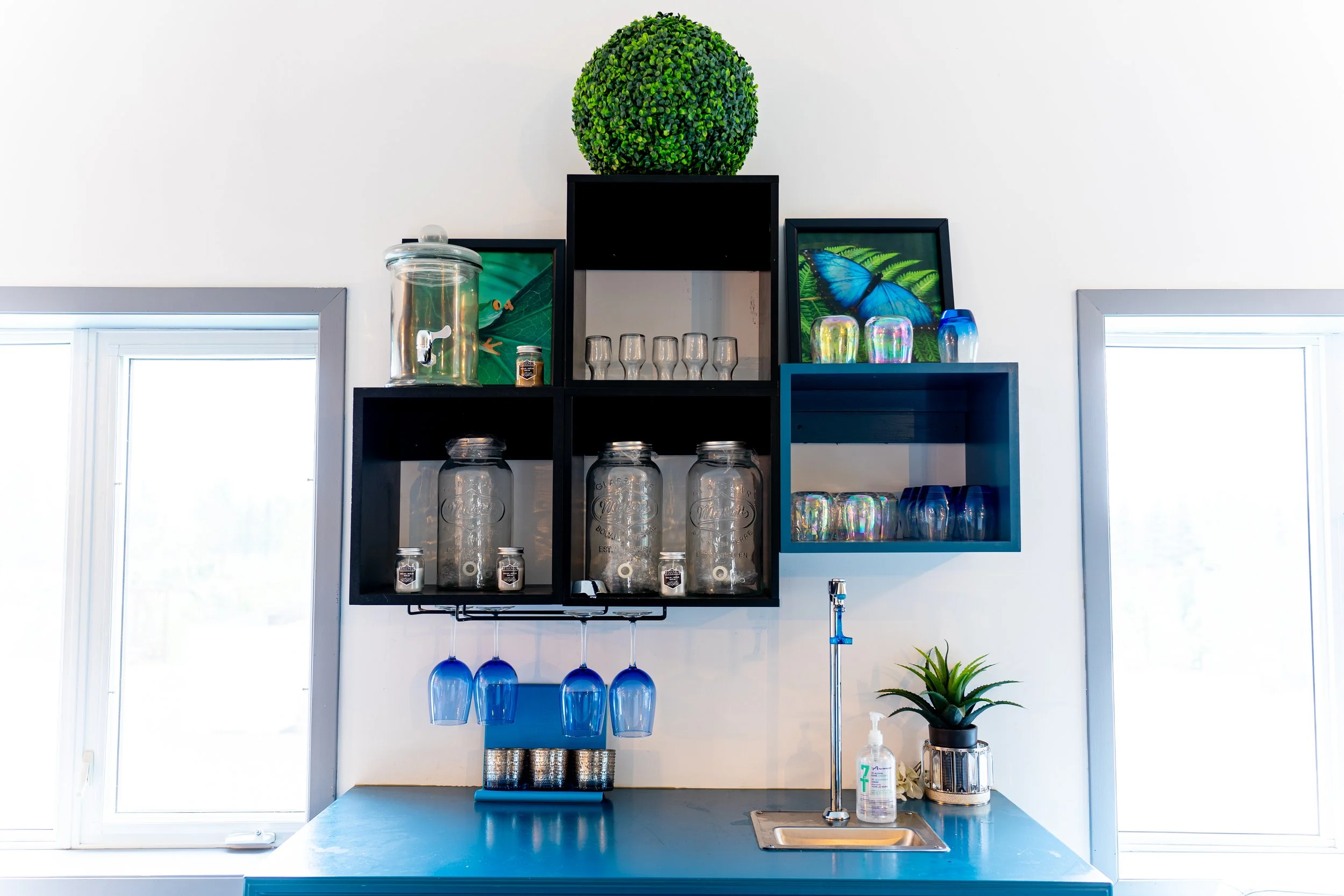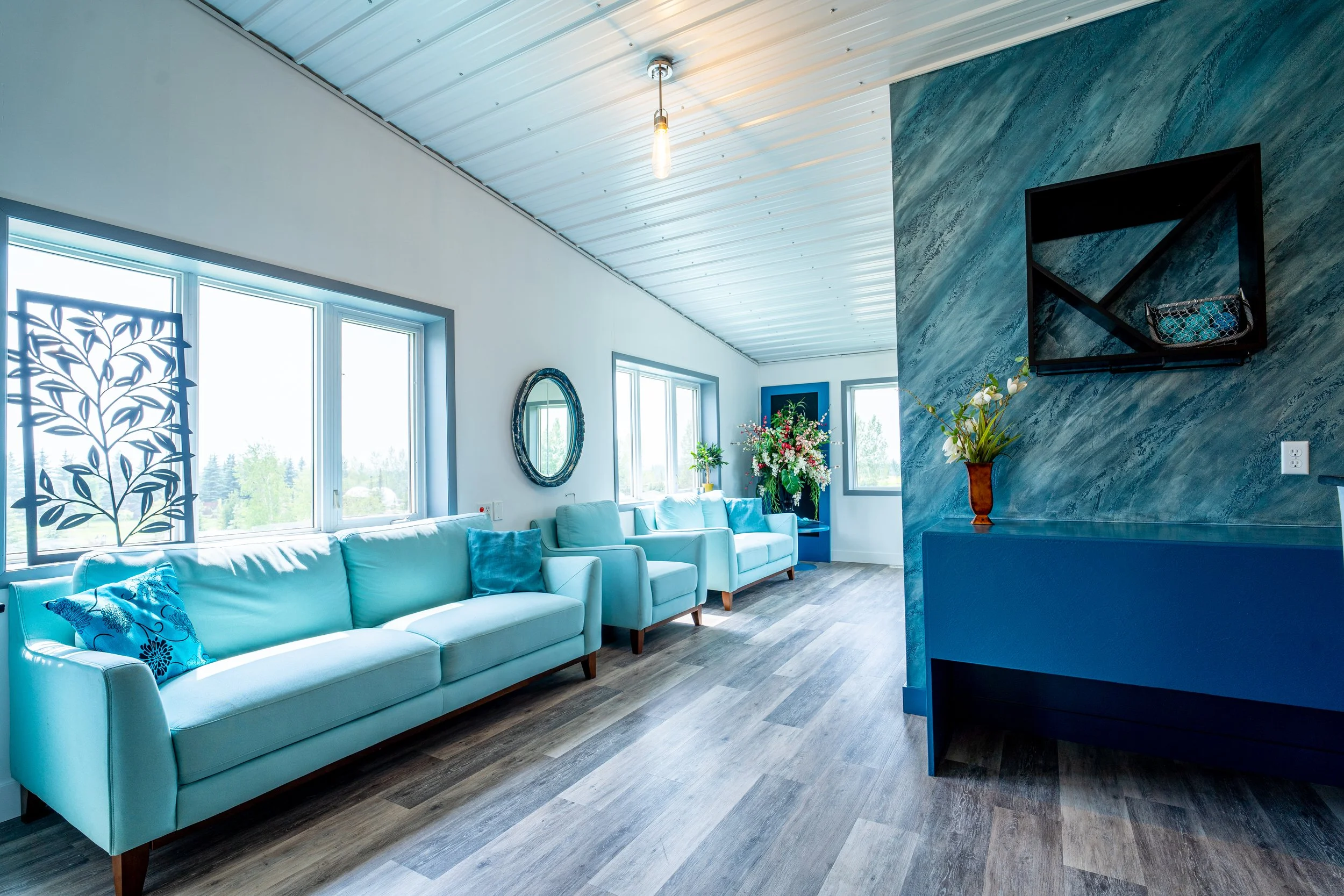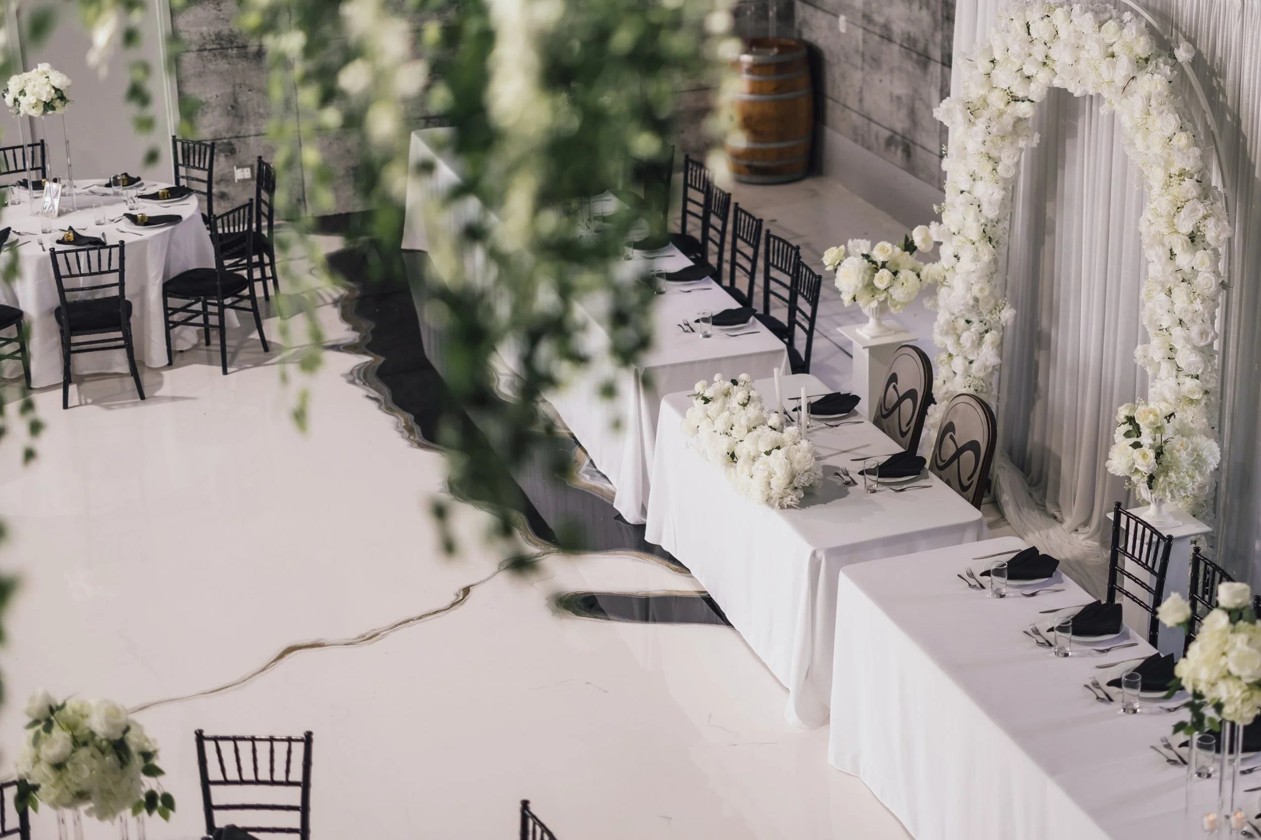 4,000 sq ft., high ceilings & a transparent overhead door—flooded with natural light year-round. Perfect for intimate to grand events. Equipped with a state-of-the-art projection and sound system featuring projectors in all corners, this area provides the flexibility to accommodate various event setups, from elegant weddings to dynamic corporate events.